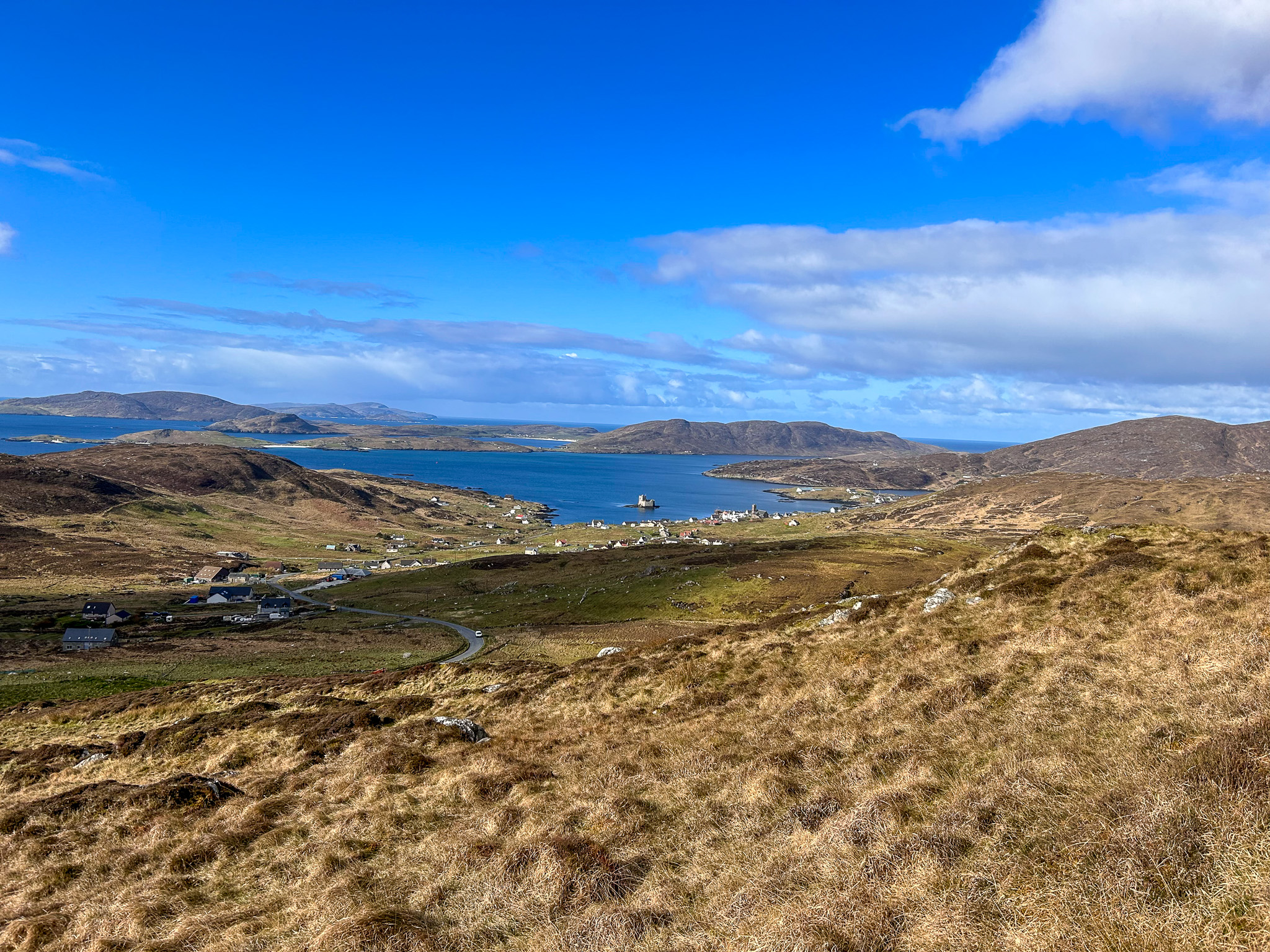 Nehvaležen popotniški dan, ko je treba vstati ob 5:30, saj je treba ujeti trajekt, a že brez njega sva v eni uri in dvajsetih minutah bila na petih otokih: Severni Uist -> Grimsay -> Benbecula -> Južni Uist -> Eriskay. Slednji je znan po ponijih, a na Eriskay se še vrneva, tako da ga pustim za kasneje. Manjši trajekt, ki je bil primerno uri bolj namenjen dnevnim vozačem kot turistom, nas je popeljal na Barro. Glavna atrakcija? Letališče na peščeni plaži! Prihodi in odhodi so pogojeni s plimo, saj ob visoki plimi letališče preprosto izgine pod vodo. Edino tovrstno letališče na svetu. Videti letalo pristati na pesku je tudi edinstven spomin. Dober začetek, sedaj pa najprej malo pohodništva in vzpon na hrib Heaval na sredini otoka. Barra je eden tistih otokov s krožno cesto in hribom na sredini, in temu primerno so razgledi veličastni, nepopisljivi. Vidi se celotna Barra, oddaljeni manjši otoki na jugu in nazaj proti severu na Eriskay in Beinn Mhor na Južnem Uistu. Vzpon je sicer bolj po brezpotju oziroma, kjerkoli so si ovce utrle pot, a razgled povrne vse.